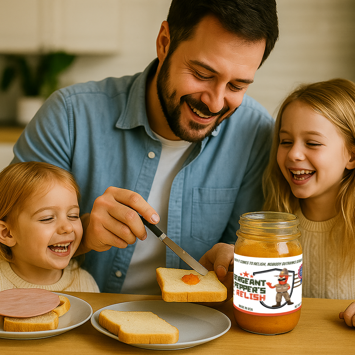 Lunchtime means more than just food—it’s a moment of care. As dad spreads our bold, flavorful relish onto a fresh sandwich, he's not just feeding his kids, he's giving them something real. Made with natural ingredients and just the right touch of heat, Sergeant Pepper’s Relish turns a simple lunch into something special. It’s a taste they’ll remember and a habit you can feel good about.